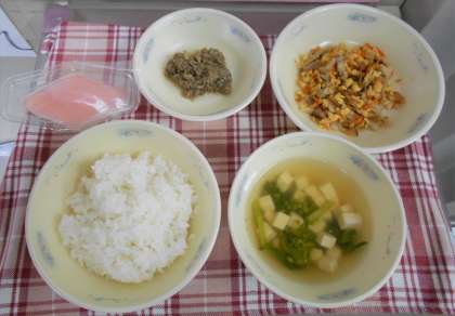 丹後地方では,「さばそぼろ」をちらしずしにのせて食べます。給食では,ちらしずしの具をごはんに混ぜ,さばそぼろをのせていただきました。