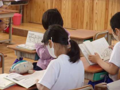 朝学習の時間の読書。みんな熱心に本を読んでいます。廊下にある学級文庫から,気に入った本をさがしています・・・ さて,“いい本”と出合えたかな?