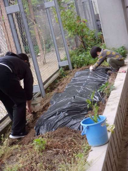 最初,教室で「マルチのはりかたをしらべよう」の映像を視聴したあと,畑で土づくりをしてマルチを張りました。