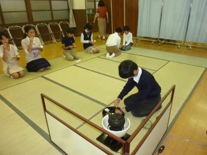 午前10時から体育館で始まった「式典」が終了した午前10時30分から,本館2階の「ふれあいルーム」で裏千家の方々のご指導による,本校茶道部の子どもたちの「子どもお茶会」が始まりました。茶道部の子どもたちはしっかりとしたお点前を披露し,お茶席券はお昼過ぎには完売し大好評でした。