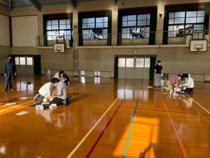 上京消防署の方にお越しいただいて,傷病者の発見から,初期対応と胸骨圧迫,AEDの使い方等救急隊につなぐまでにできることをしっかりと学びました。