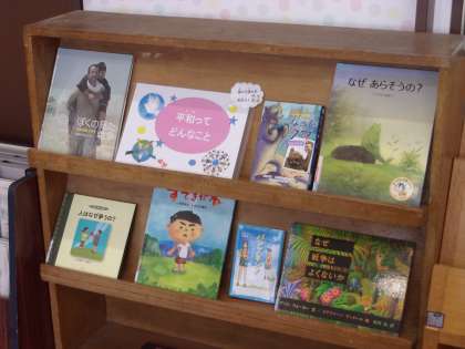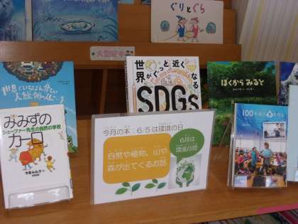 6月の「環境週間(かんきょう しゅうかん)」に合わせて,《自然(しぜん)や植物(しょくぶつ)・山や森が出てくるお話》コーナーができています。