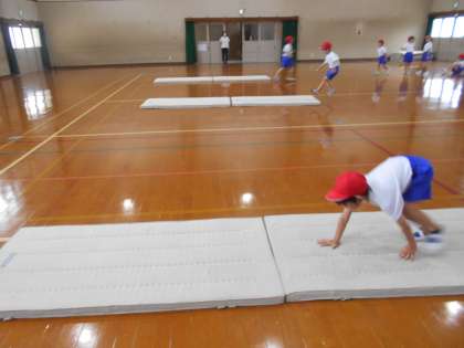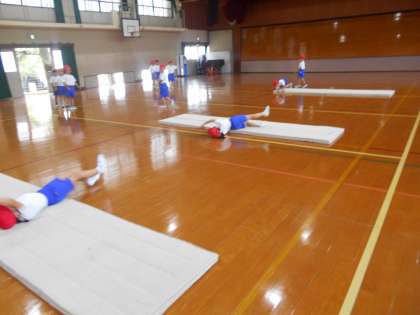 1年生は動物になりきって歩いたり転がったりして楽しんでいます。初めは「無理だ〜!」と言っていた後ろ転がりも,どんどんチャレンジして上手になってきました。