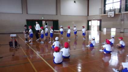 1・2年合同で、「レッツぼうけんダンス」を練習しています。
