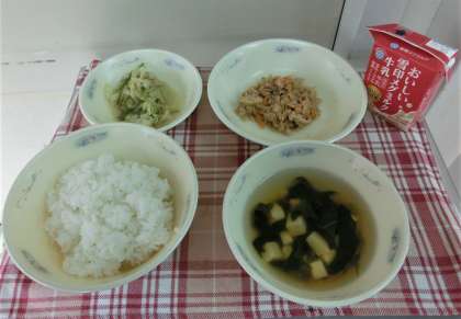今日の給食の「おからツナどんぶりの具(ぐ)」は,ごはんにのせて食べました。ごはんがとってもおいしくなりましたね・・・