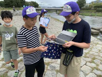 京極の鴨川を「だれもが気持ちよく利用できる川」にしていくために、鴨川を再調査したり、生き物について商店街で呼びかけをしたりしました。どうすればそのような川になるのか、よく考えながら活動をしています。