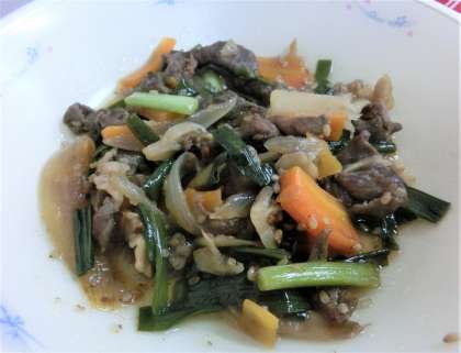 「プルコギ(불고기)」は、韓国(かんこく)・朝鮮(ちょうせん)の料理(りょうり)です。うすく切った牛肉(ぎゅうにく)に、さとうやしょうゆであまからく味をつけてから、野菜(やさい)と “きのこ”をいっしょにいためて作りました。