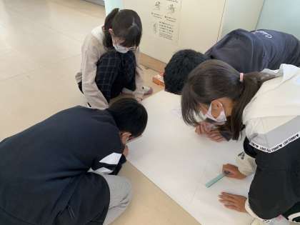 2 算数科では、運動場に大きな拡大図を描くために、まずは模造紙のサイズで練習をしました。それぞれ何倍する必要があるのか、どうしたら大きな円を描けるのかなど、試行錯誤を重ねました。