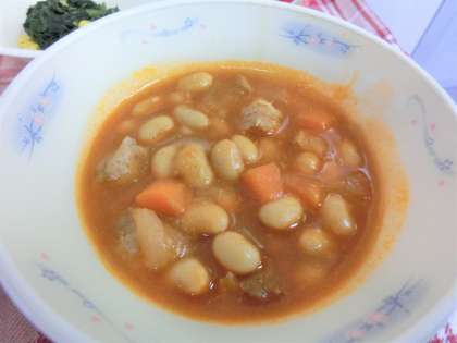 「ポークビーンズ」は、大豆(だいず)、ぶた肉(にく)、野菜(やさい)をじっくり煮込んだ トマト味(あじ)の献立(こんだて)です。