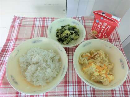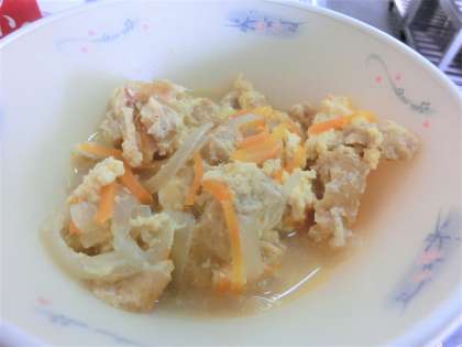 今日の「あげたま煮」は、ときたまごをむすように調理(ちょうり)することで、ふあっとした食感(しょっかん)になります。