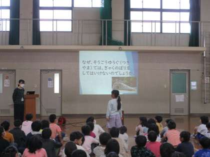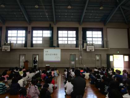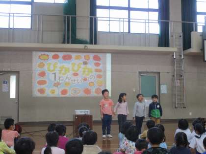 今日の1校時は、今年度初めてのぽかぽか朝会でした。まず初めに校長先生から、5月3日の憲法記念日にちなんで、「きまりは何のためにあるのかをみんなで考えよう」と問いかけがありました。「楽しく過ごせるように」「みんなが笑顔になるため」「安心・安全のため」などの意見が出ていました。校長先生から「きまりは、みんなのしあわせのためで、これからもみんなが幸せになるようにきまりを守っていきましょう。」と話がありました。次に、総合遊具などの使い方についてみんなで考えました。最後に、各学級から学級目標の発表がありました。それぞれの学級で決めた目標についてしっかり発表できました。