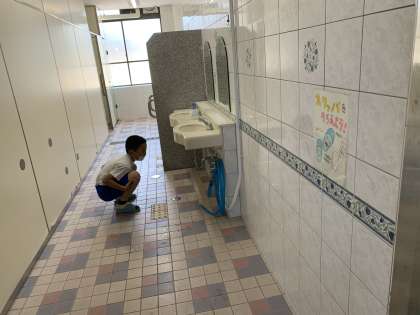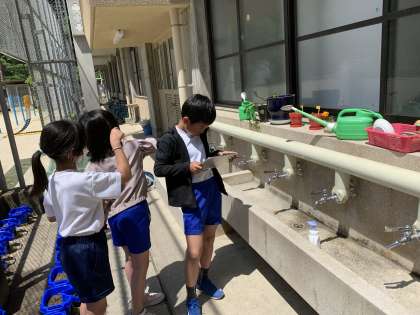 生活でどれだけ水が使われているのかを考えています。まず、学校の蛇口の数を知るために校内を探し回りました。学校には蛇口が100個以上あることに驚き、学習資料から京都市では1日に5億L近くも給水していることを知り、さらに驚いた様子でした。これから、その水がどこから、どのように私たちのもとに運ばれてくるのかを学習していきます。