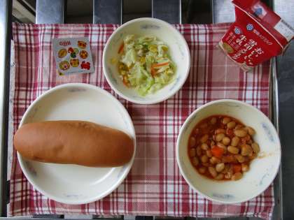 今日の給食「大豆と鶏肉のトマト煮」は、ふっくらとした大豆とトマトのコクを味わっておいしくいただきました。「野菜のソテー」も味付けがちょうどよく、おいしかったです。ごちそうさまでした。