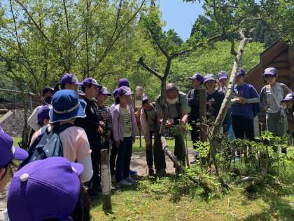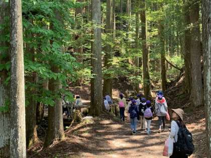 昼食までの時間を、山の家の敷地内を散策して過ごしています。ボランティアスタッフの方から植物の説明を聞いたり、大木の茂った山道を歩いたり…