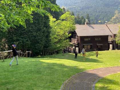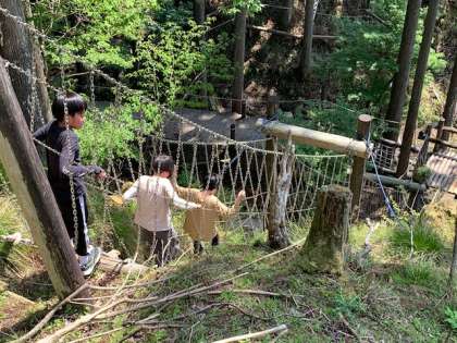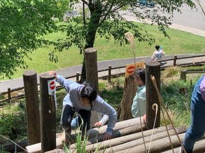 冒険の森でアスレチックをした後、フライングディスクゴルフをしています。簡単そうで難しい…