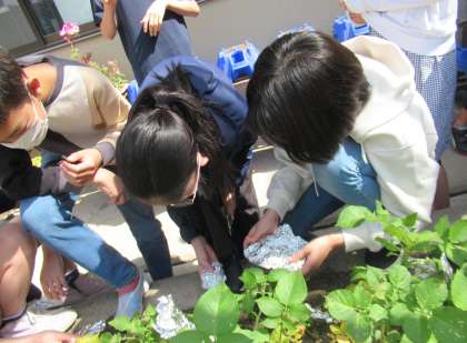 何枚かのじゃがいもの葉にアルミホイルを巻き、アルミホイルで覆った葉とそうでない葉を比べる実験をしました。