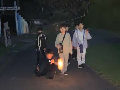 行燈(あんどん)ではわかりませんね。簡易なランタンを頼りに、グループでナイトハイクを楽しんでいます。薄暗い山道は、ちょっと怖いかな…