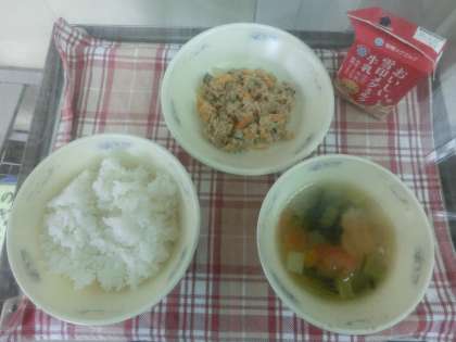 今日はセルフ給食の日でした。毎月配布している給食献立表に子どもが器を持って何かを混ぜているイラストがついている日は「セルフ給食」献立です。