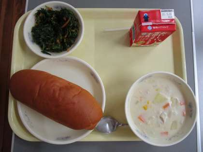 今日の給食「ほうれん草のソテー」に使われている「ほうれん草」は血液をつくるもとになる鉄が多く含まれています。ヨーロッパでは「胃腸のほうき」とよばれるくらい腸をきれいにする作用があります。「コーンのクリームシチュー」は具たくさんでパンによく合い、おいしくいただきました。ごちそうさまでした。