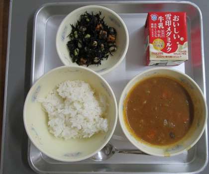 今日の給食「ポークカレー」は、人気のある献立の1つで、子どもたちは、とても喜んで食べていました。また「ひじきのソテー」に入っているひじきには、骨や歯をつくる「カルシウム」やお腹の調子を整える「食物繊維」が多く含まれています。カレーライスともよく合い、おいしくいただきました。