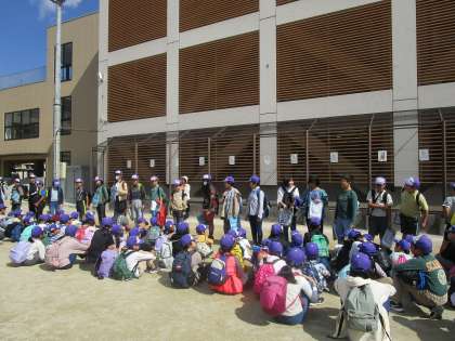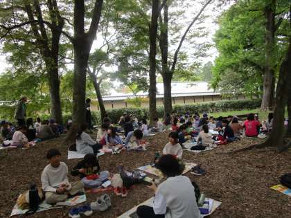 ネイチャーラリーの後は、みんなが楽しみにしていたお弁当の時間です。たてわりグループで集まって外で食べるお弁当は格別でした。その後、ふれあい探索のふりかえりでは、「まつぼっくり入れがおもしろかった。」「グループのみんなと協力してミッションがクリアできて良かった。」などの感想が出ていました。最後に学校に戻って、閉会式をし、たてわり探索でリーダーとして他の学年を引っ張ってくれた6年生にみんなで拍手をしました。保護者の皆様には、お弁当のご協力、ありがとうございました。今日のふれあい探索の話をご家庭でも聞いてみてください。