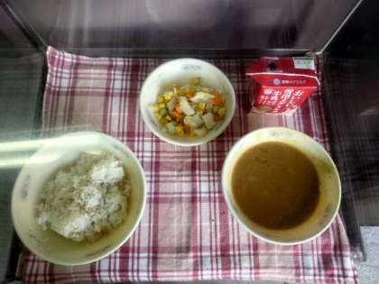 給食のカレーやシチュー、ハッシュドビーフなどのルーは、給食調理員さんの手作りです。大きな釜に、サラダ油とバターを入れ、バターがとけたら弱火にし、小麦粉を入れます。時間をかけていためて、なめらかなルーを作っています