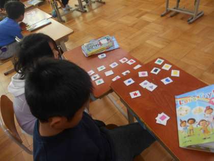 外国語活動で、正方形や長方形、丸などの形の英語の言い方を学習しました。これまでの色や動物と違って、子どもたちにとっては耳慣れない言葉もありましたが、ALTの発音をしっかり聞いて、声に出していました。