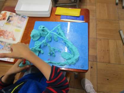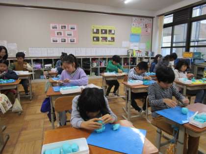 今日、図画工作科「おもいでをかたちに」の学習で、楽しかったことやがんばったことなどを粘土で表しました。粘土をひねったり、丸めたり、押したりして表現できました。