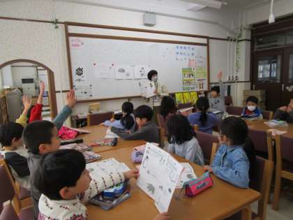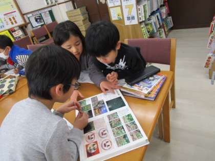 今日の図書の時間に図鑑を使って「ダンゴ虫の足は何本か?」「たんぽぽの根っこは長いか?何cmくらいか?」を調べました。グループで協力して調べられました。
