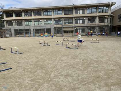 自分に合ったハードルの間隔を見つけ、よりよいタイムで走り抜けられるように学習を進めています。グループで声を掛け合いながら、場の準備や学習活動を協力して進めています。