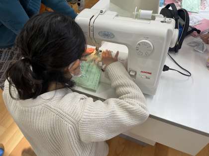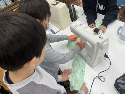 5年生ではミシンのいろいろな名前や使い方を学び、ミシンを使って縫えるようになりました。そこで、手作りランチョンマットに挑戦しています。自分のお気に入りの布を使って、給食のときに使えるようなランチョンマットが縫えるように、みんなで協力しながら頑張っています。