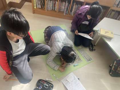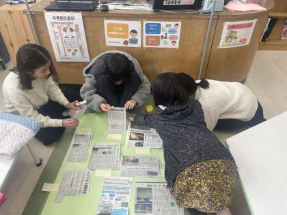 国語科の図書の学習で、自分のお気に入りの新聞記事を持ち寄って、グループで一つの大きな新聞を作る「読みまわし新聞」を作成しています。集めた記事を貼り、見出しを付けたり、コメントを書いたりと、グループそれぞれ知恵を出し合いながら作っています。