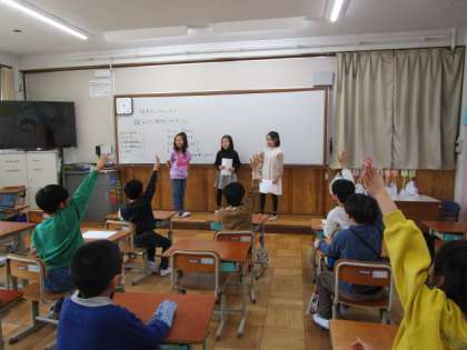 2年生は英語活動「絵本をしょうかいしよう」の学習で、作った絵本をグループごとに英語で紹介しました。色や生き物を英語で紹介し、最後にクイズをしました。2年生の英語活動は今日が最後の学習でした。3年生の外国語活動も楽しみにしている子どもたちです。