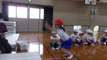 「ぽかぽか朝会」で、全校のみんなの前で1年生も学級目標を発表した様子です。体育は雨だったので、体育館で立ち幅跳びを行いました。思いっきり腕をふって、しゃがんでから跳ぶと距離がのびることに気付いていました。