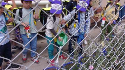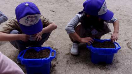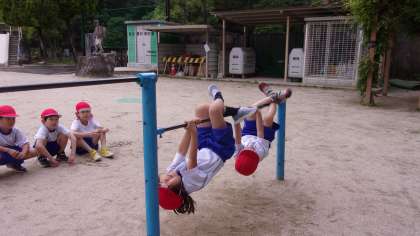鉄棒あそびで、安全に学習するための約束を知りました。鉄棒にぶら下がってみると、「手が痛くなった」や「もっとやりたい」等の声がありました。そして、2年生からもらったアサガオの種をまきました。これから、様子を見るのが楽しみですね。