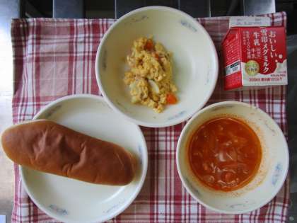 今日の給食「ベーコンとポテトの変わりオムレツ」は子どもたちに人気のあるメニューの1つです。卵がふわふわでとてもおいしかったです。オムレツもトマトスープもミルクコッペパンによく合いました。