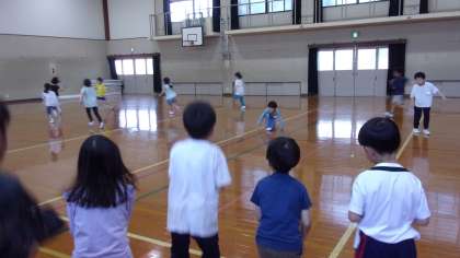 みんなでおにごっこをしました。今日は「バナナおに」です。復活するには、味方に2回タッチをしてもらわないといけません。バナナになった時には「こっちきて〜」「タッチして〜」と叫んでいました。