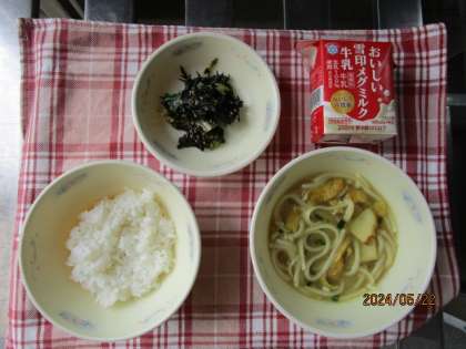今日の給食「きつねカレーうどん」は子どもたちに人気のある献立の1つです。油あげやかまぼこ、たまねぎ、つるんとしたうどんをカレー味のだしとからめておいしくいただきました。ごちそうさまでした。