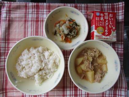 今日の給食「肉じゃが」は少しピリ辛で食欲が増し、ご飯がよく進みました。また、「ごま酢煮」に使っているキャベツとにんじんは、スチームコンベクションオーブンを使って蒸しています。野菜の甘味や米酢の酸味を感じながらいただきました。ごちそうさまでした。