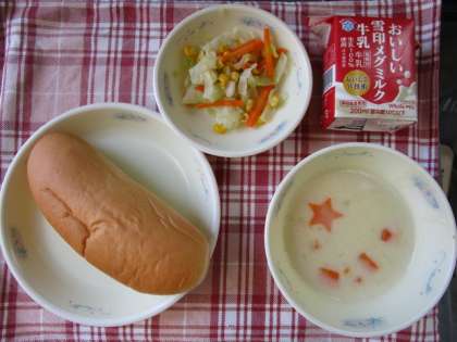 今日の給食「じゃがいものクリームシチュー」は具だくさんで、パンともよく合い、おいしくいただきました。「ハッピーキャロット」の日で、星形のにんじんが入っていた子どもは「今週1週間いいことあるわ!」と喜んでいました。ごちそうさまでした。