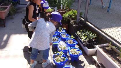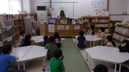 朝の様子です。アサガオ、オジギソウ、ヒマワリ、コスモス、などたくさんの芽が出てきました。もう一枚は、図書館での様子です。今日は紙芝居の読聞かせがありました。