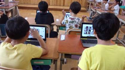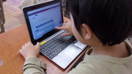 朝はオジギソウタッチをして元気かどうかを確かめています。ギガ端末を使ってチームズに入りました。みんなの顔が映ると歓声があがりました。ミライシードの国語と算数の問題にも挑戦しました。「かんたん。かんたん。」と言ってどんどん解き進めていました。