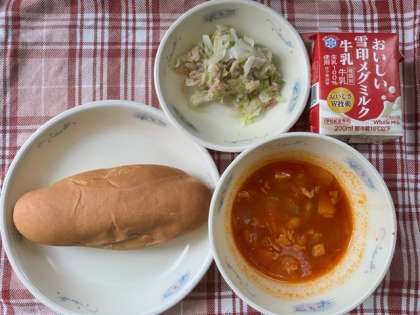 今日の給食はツナサンドです。スプーンを使ってパンを開き、自分だけのツナサンドを作りました。具は、さとうやリンゴ酢などで味付けをしたフレンチ味です。さっぱりとした味を楽しみましょう。