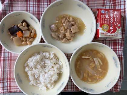今日の献立の「五目煮豆」と「みそ汁」には大豆が使われています。