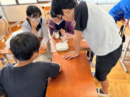 ダイラタンシー現象の実験を通して、2つの量を比に表すことを学習しました。かたくり粉と水の割合を、「20:10だと…」「20:17なら…」などと、比を使っていろいろに試すことができました。
