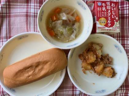 豚肉とじゃがいもを使用し、さとう・トマトケチャップ・ウスターソースで味つけをします。じゃがいもにはビタミンCが多く含まれ,免疫力を高めてくれます。じゃがいものホクホクした食感と、トマトケチャップのあま味やうま味を味わって食べました。
