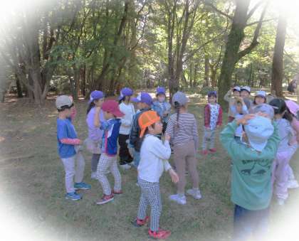 御苑に秋みつけをしに行ったら、鶴山保育所のお友達と偶然出会いました。少しの間一緒に遊びました。