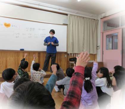下の写真は、生活科「いきものとなかよし」の学習で、動物のお医者さんに来ていただいたときのものです。獣医さんに質問したり、抱っこの仕方を教えてもらったりしました。聴診器で自分の心音を聴いたり友達と聴き比べたり、ウサギの心音も聴きました。生き物によって心拍数の数が違う事に驚きの声があがっていました。