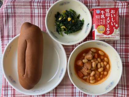 今日の献立紹介は「大豆と鶏肉のトマト煮」です。大豆はタンパク質がとても多く含まれていて、お肉と同じように体を作る元になります。だから大豆は畑の肉と呼ばれています。今日の大豆と鶏肉のトマト煮は、トマトの旨みや大豆の甘みを味わっていただきました。