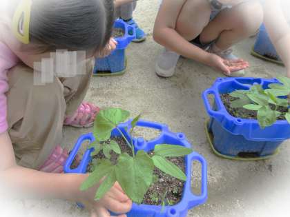 今日で、1・2年合同のリレーあそびが終わりました。互いに応援し合っていましたね。生活科では学校探検後、自分が校内で見つけた物をカードに書いて教室内のポケットに入れています。アサガオのプランターの草引きをている写真です。